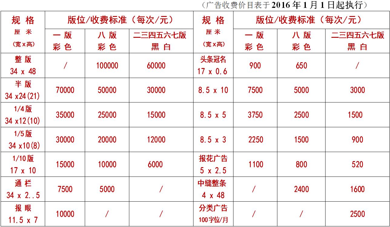 6、本報廣告刊登規(guī)格有整版、1/2版、1/4版、1/5版、2/5版、1/10版等,其中一、四版為彩色廣告;五、八版為套紅廣告;其余版面為黑白廣告。